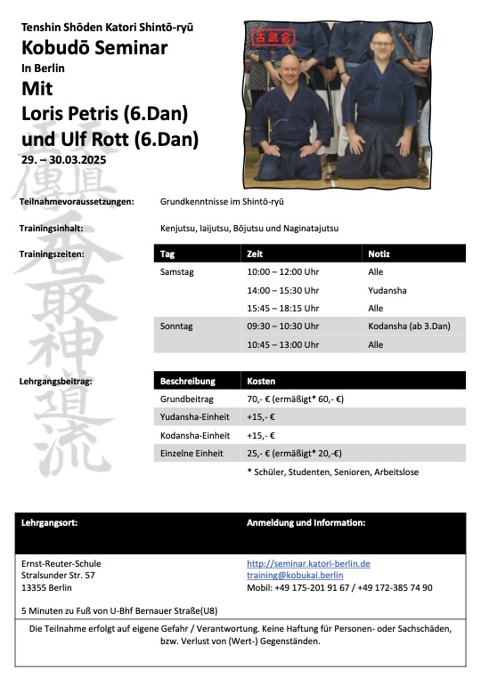 Wir laden Sie zu einem Seminar mit Sensei Loris Petris (6. Dan) und Ulf Rott (6. Dan) w Berlin (Deutschland).